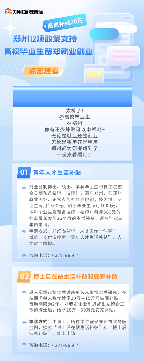 近年來,鄭州市通過盤活存量房源用作人才公寓、發(fā)放購房租房補(bǔ)貼等形式,多渠道解決人才階段性居住需求。比如,鄭州市創(chuàng)新實(shí)施人才補(bǔ)貼,除了人才公寓以外,符合條件的博士、碩士、學(xué)士學(xué)位畢業(yè)生,5年內(nèi)分別可享每月3000元、1500元、1000元房租補(bǔ)助,購房給予10萬元到30萬元不等的一次性購房補(bǔ)貼。