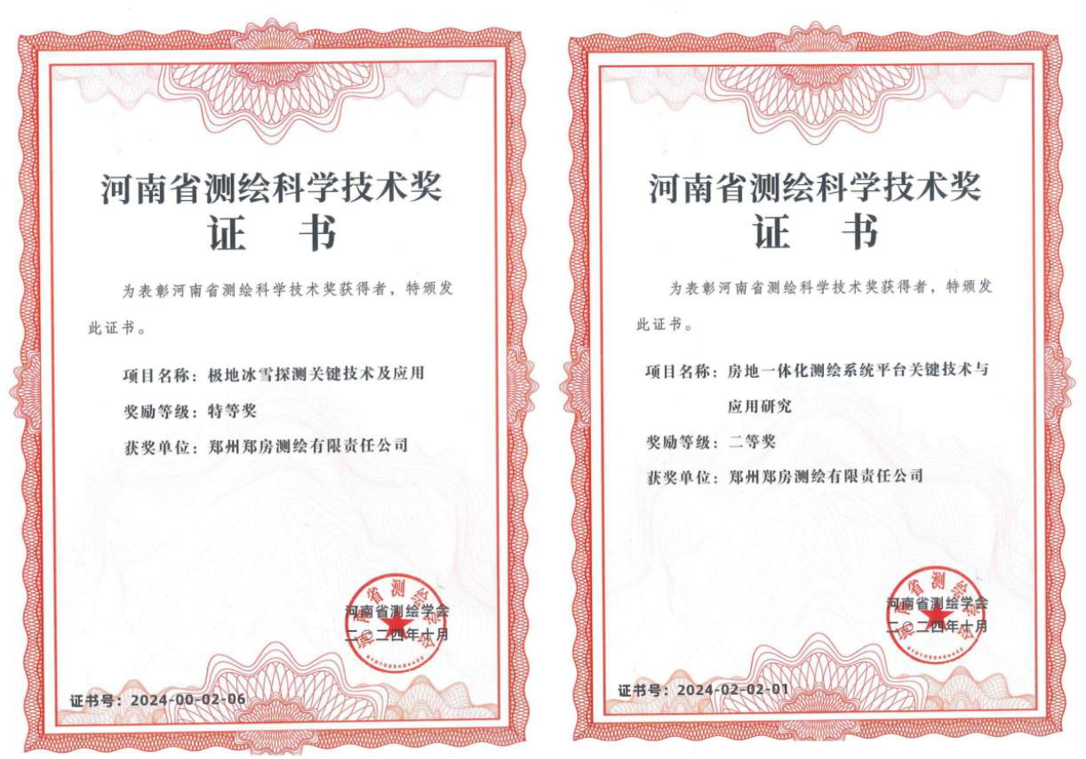 ?近期,鄭州鄭房測繪有限責(zé)任公司在科研領(lǐng)域取得重大突破,與相關(guān)單位聯(lián)合研發(fā)的《極地冰雪探測關(guān)鍵技術(shù)及應(yīng)用》和《房地一體化測繪系統(tǒng)平臺關(guān)鍵技術(shù)與應(yīng)用研究》兩個項目分別榮獲河南省測繪學(xué)會頒發(fā)的科學(xué)技術(shù)成果特等獎和二等獎,為公司科技創(chuàng)新工作再添濃墨重彩的一筆。