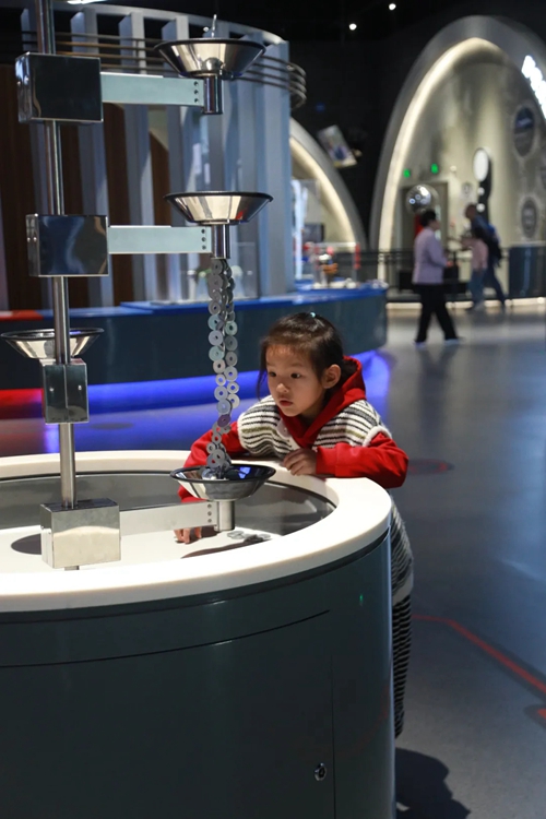 下一站是“看得見的奧秘”展廳。在參觀中,不難發(fā)現(xiàn),這里主要提煉了物質(zhì)、運(yùn)動(dòng)和能量三個(gè)小切口作為知識(shí)內(nèi)容,以“透過(guò)現(xiàn)象看本質(zhì)”為主題,劃分“物質(zhì)世界”“能量法則”“運(yùn)動(dòng)大觀”“度量萬(wàn)物”四個(gè)分主題展區(qū)。