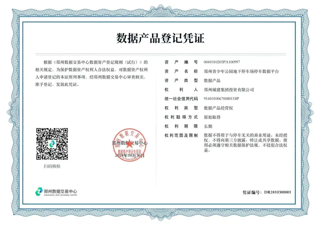 10月30日,城發(fā)集團下屬子公司鄭州城建集團投資有限公司(以下簡稱“城建集團”)在鄭州數(shù)據(jù)交易中心成功完成了“鄭州青少年公園地下停車場停車數(shù)據(jù)平臺”數(shù)據(jù)產(chǎn)品的資產(chǎn)登記,喜獲數(shù)據(jù)產(chǎn)品登記憑證,成為鄭州市首家將停車數(shù)據(jù)資產(chǎn)入表的國有企業(yè)。