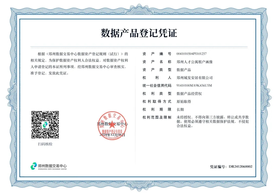 12月6日,鄭州城市發(fā)展集團有限公司下屬子公司鄭州城發(fā)安居有限公司(以下簡稱“城發(fā)安居”)在鄭州數據交易中心成功完成了“鄭州人才公寓租戶畫像”的資產登記,正式取得數據產品登記憑證,成為鄭州首例將人才公寓運營數據資產入表的市屬國企。
